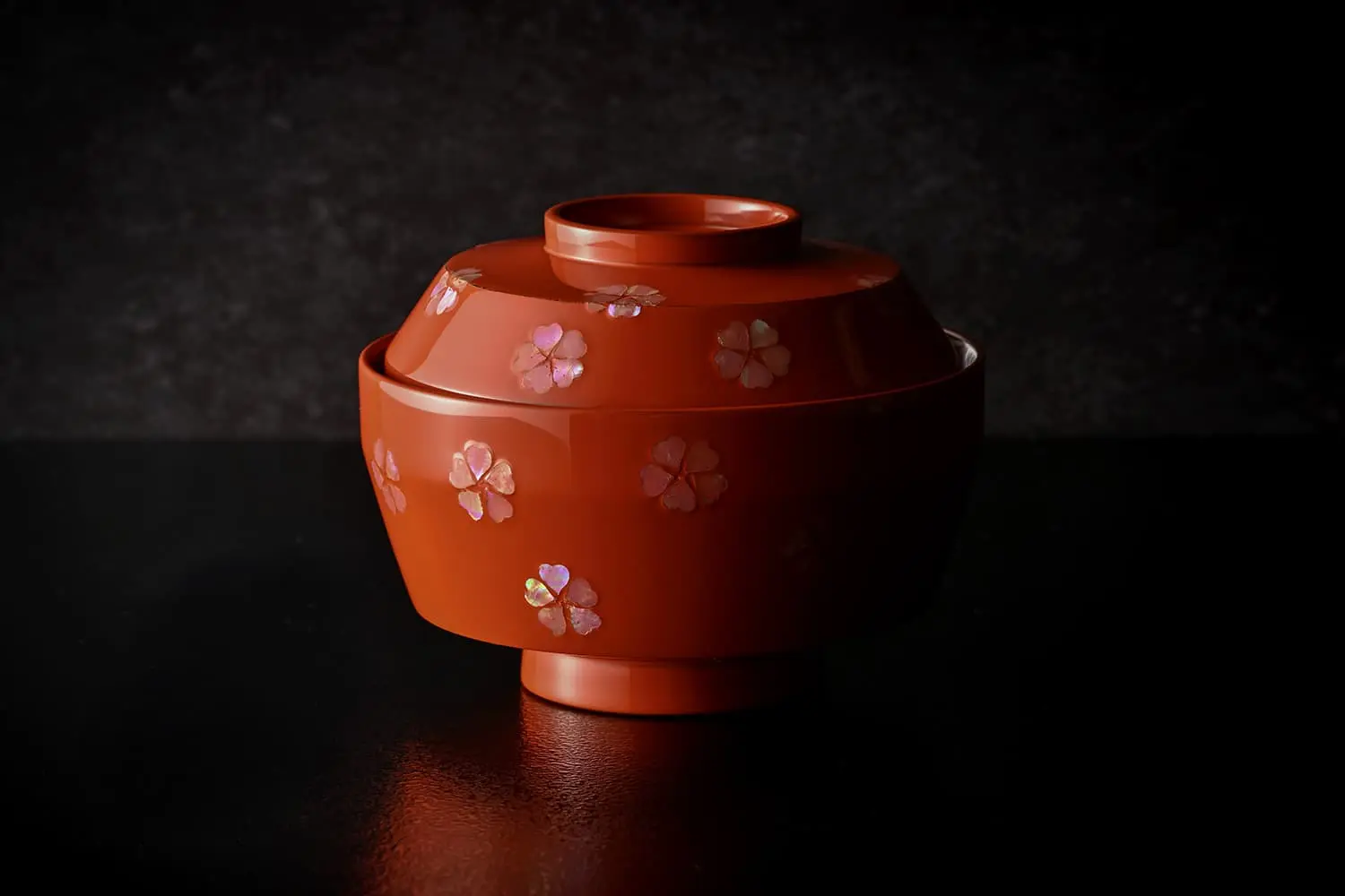 技術的な面で言えば、実は螺鈿の椀は貝の部分が剥落してしまいがちで、何度も繰り返し使用する料理店には不向きな技法といえます。